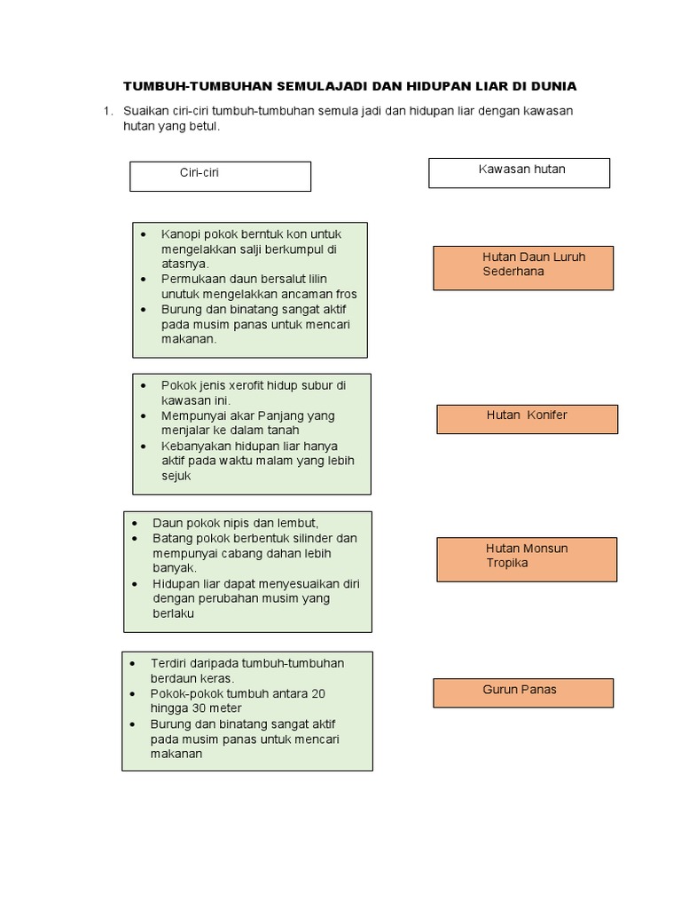 Mari kita kenali tumbuh-tumbuhan semula jadi dan hidupan liar di kawasan Gurun Panas Hutan Monsun Tropika Hutan Daun Luruh Sederhana dan Hutan Konifer. Hutan beriklim berlaku pada garis lintang antara kira-kira 25 hingga 50 di kedua-dua belahan. Ciri tumbuhan semula jadi dan ciri hidupan liar Add to my workbooks 10 Embed in my website or blog Add to Google Classroom.